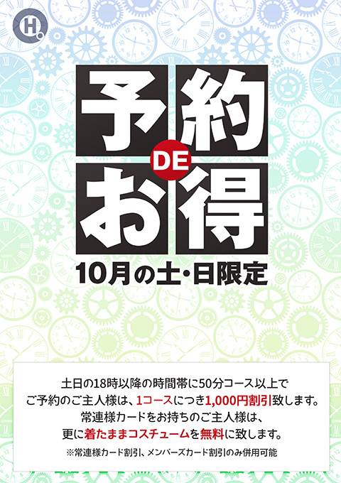土日の18時以降の時間帯に50分コース以上でご予約のご主人様は、1コースにつき1,000円割引致します。