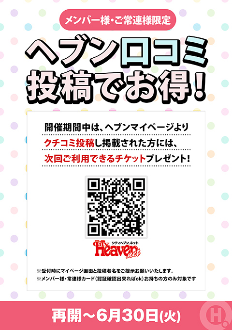 メンバー様・ご常連様限定/ヘブン口コミ投稿でお得!