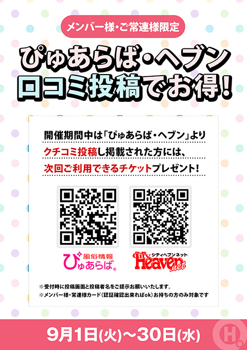 開催期間中は「ヘブン・ぴゅあらば」よりクチコミ投稿し掲載された方には、次回ご利用できるチケットプレゼント!