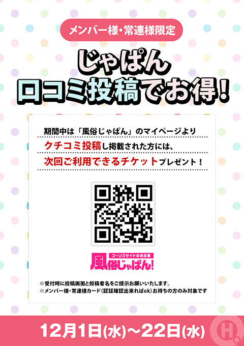 期間中は「風俗じゃぱん」のマイページよりクチコミ投稿し掲載された方には、次回ご利用できるチケットプレゼント!
