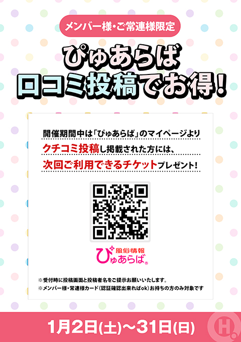 メンバー様・ご常連様限定/ぴゅあらば口コミ投稿でお得!