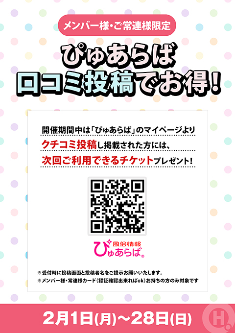 メンバー様・ご常連様限定/ぴゅあらば口コミ投稿でお得!