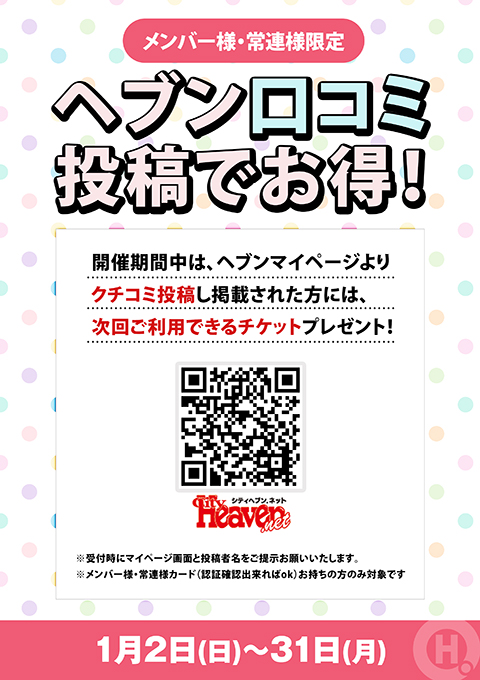 開催期間中は、ヘブンマイページよりクチコミ投稿し掲載された方には、次回ご利用できるチケットプレゼント!