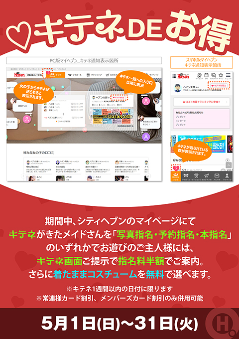 期間中、シティヘブンのマイページにてキテネがきたメイドさんを「写真指名・予約指名・本指名」のいずれかでお遊びのご主人様には、キテネ画面ご提示で指名料半額でご案内。