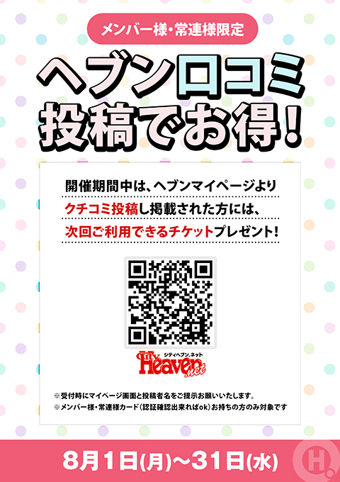 開催期間中は、ヘブンマイページよりクチコミ投稿し掲載された方には、次回ご利用できるチケットプレゼント!