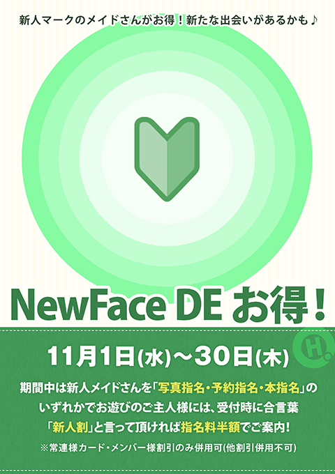 期間中は新人メイドさんを「写真指名・予約指名・本指名」のいずれかでお遊びのご主人様には、受付時に合言葉「新人割」と言って頂ければ指名料半額でご案内!