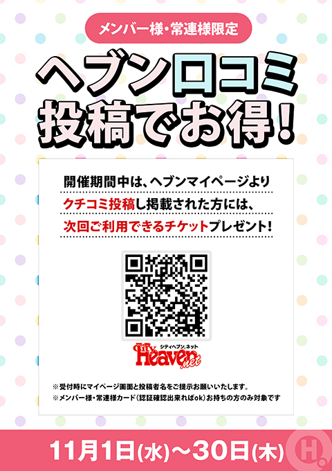 メンバー様・常連様限定/ヘブン口コミ投稿でお得!