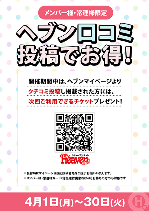 開催期間中は、ヘブンマイページよりクチコミ投稿し掲載された方には、次回ご利用できるチケットプレゼント!