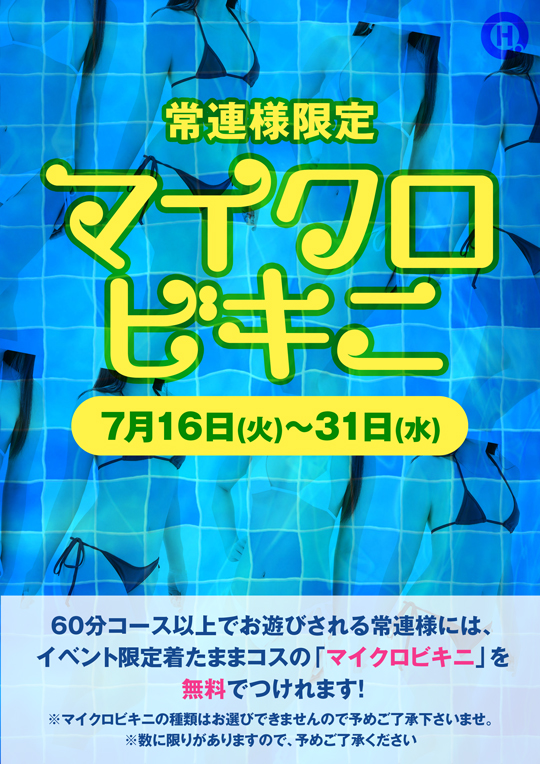 60分コース以上でお遊びされる常連様には、イベント限定着たままコスの「マイクロビキニ」を無料でつけれます!