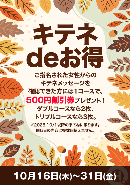 ご指名された女性からのキテネメッセージを確認できた方には1コースで、500円割引券プレゼント!