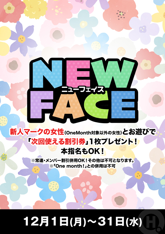 新人マークの女性(OneMonth対象以外の女性)とお遊びで「次回使える割引券」1枚プレゼント!本指名もOK!