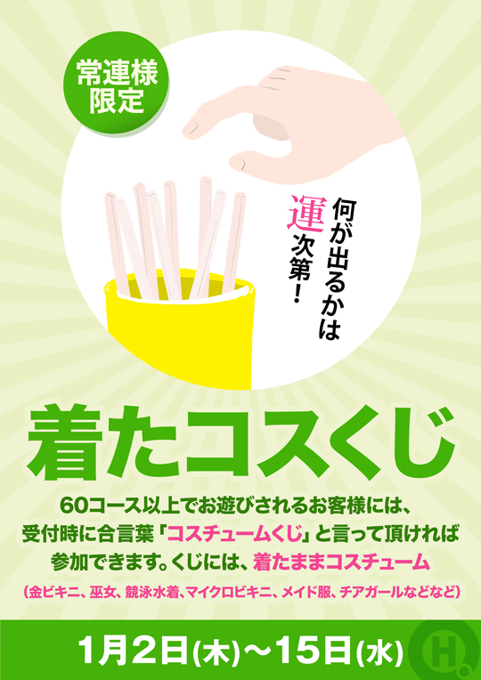 60コース以上でお遊びされるお客様には、受付時に合言葉「コスチュームくじ」と言って頂ければ参加できます。