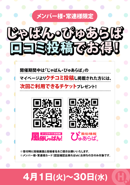 メンバー様・常連様限定/じゃぱん・ぴゅあらば口コミ投稿でお得!
