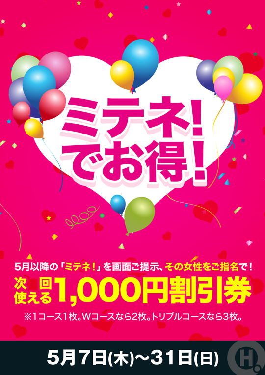 5月以降の「ミテネ!」を画面ご提示、その女性をご指名で!次回使える1,000円割引券※1コース1枚。Wコースなら2枚。トリプルコースなら3枚。